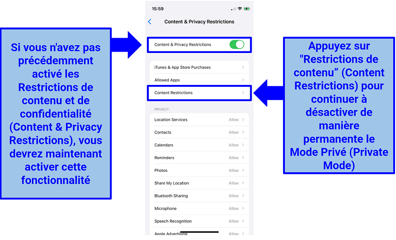 Étape 2. Appuyez sur l'interrupteur à côté de Contenu & confidentialité (Content & Privacy Restrictions) puis sélectionnez Restrictions de contenu (Content Restrictions).