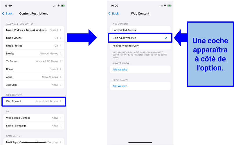 Étape 6. Sous les réglages de Contenu & Confidentialité (Content & Privacy), sélectionnez Restrictions de contenu (Content Restrictions). Ensuite, naviguez jusqu'à Contenu Web (Web Content) et choisissez Limiter les sites web pour adultes (Limit Adult Websites). Ce réglage va désactiver la navigation privée et restreindre l'accès à de nombreux sites pour adultes.