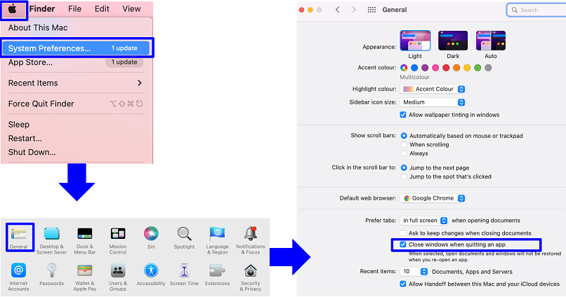 Étape 3 (facultative). Si vous ne voyez pas cette option, cliquez sur l'icône Apple en haut à gauche de Safari, puis rendez-vous dans Préférences Système (System Preferences) suivi de Général (General). Activez maintenant l'option Fermer les fenêtres à la fermeture d'une application (Close windows when quitting an application). Vous devriez maintenant pouvoir configurer Safari pour qu'il s'ouvre avec une fenêtre de navigation privée comme décrit dans l'étape précédente.