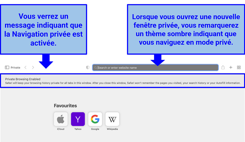 Lorsque la navigation privée est activée, vous verrez ce message :