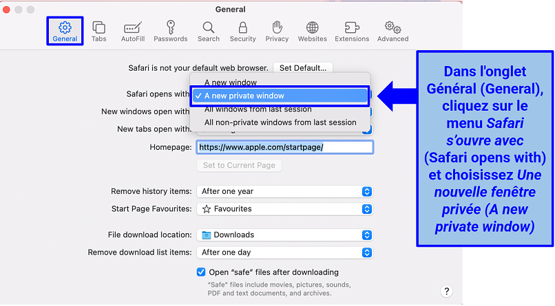 Étape 2. Dans l'onglet Général (General), cliquez sur l'option Safari s’ouvre avec (Safari opens with) et choisissez Une nouvelle fenêtre privée (A new private window).