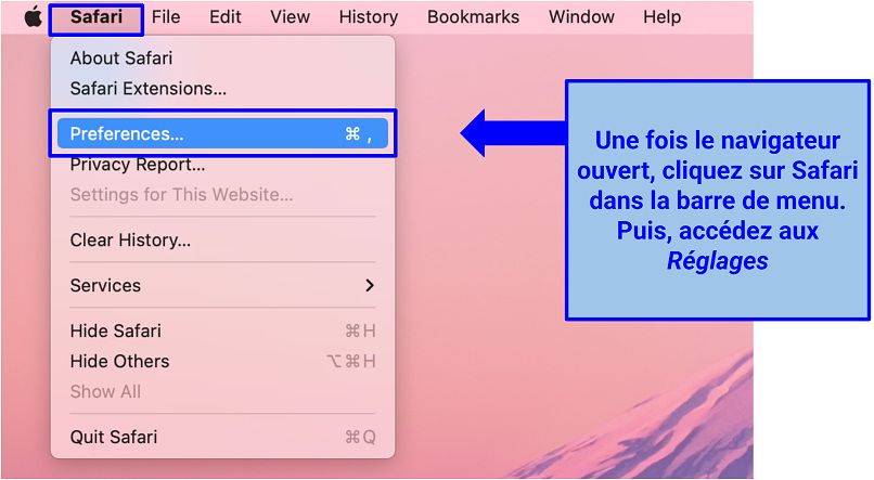- Rendez-vous dans le menu Safari et sélectionnez Préférences (Preferences).